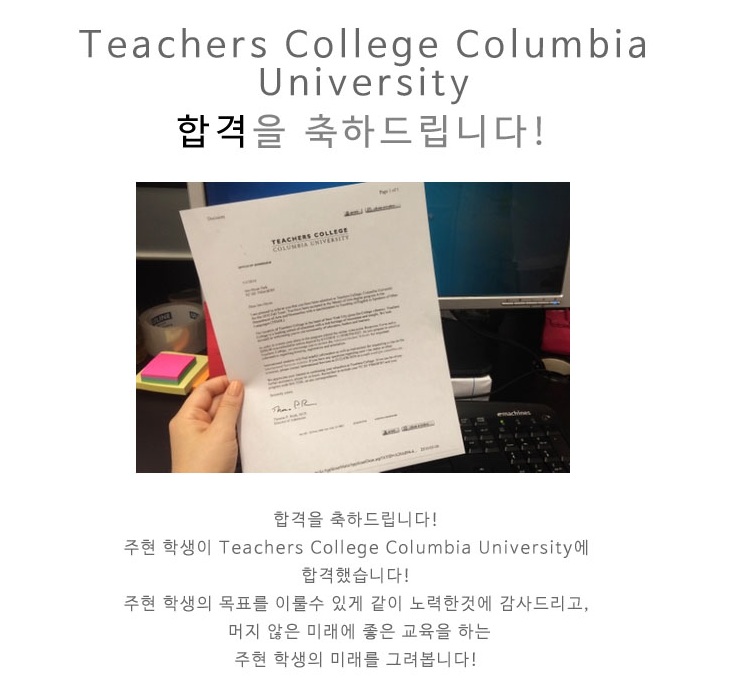 [합격장] Teachers College Columbia 합격을 축하드립니다~